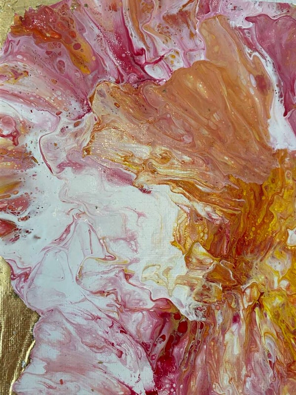 Dit is een bloem uit de (abstracte) FLOWER collectie. De gouden achtergrond en de gebruikte kleuren maken dit wellicht wel de meest vrouwelijke Flower van de collectie. Het gebruik van bladgoud en de glanzende vernislaag zorgen ervoor dat het een chique blikvanger is aan de muur. In tegenstelling tot de anders Flowers uit deze collectie, heeft dit werk een 'dripping effect' aan de zijkant van het doek, waardoor de bloem ook over de rand doorloopt.