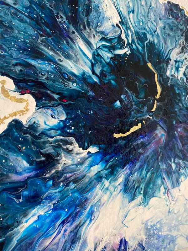 Dit is een bloem uit de (abstracte) FLOWER collectie. Hoewel het een bloem vormt, geeft het kleurgebruik en de celvorming een knipoog naar het intergalactische. Het selectieve gebruik van bladgoud, in combinatie met het pruisisch blauw zorgt voor een chique look.
